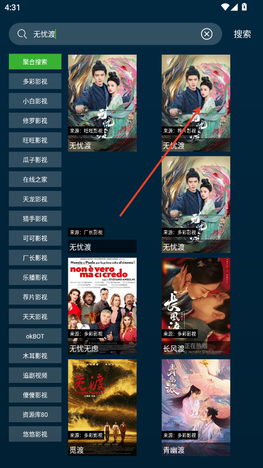 最大的特别就是直接在左上角切换源,而且每个源都相当于一个新的影视资源站