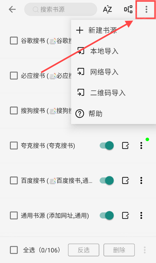 3、目前内置了100多个书源,点击右上角三个点按钮打开更多选项,有本地导入、网络导入和二维码导入三种方式供用户选择