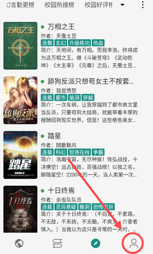 3、进入软件首页之后,点击下方的圆形按钮,会出现很多不同种类的书籍。