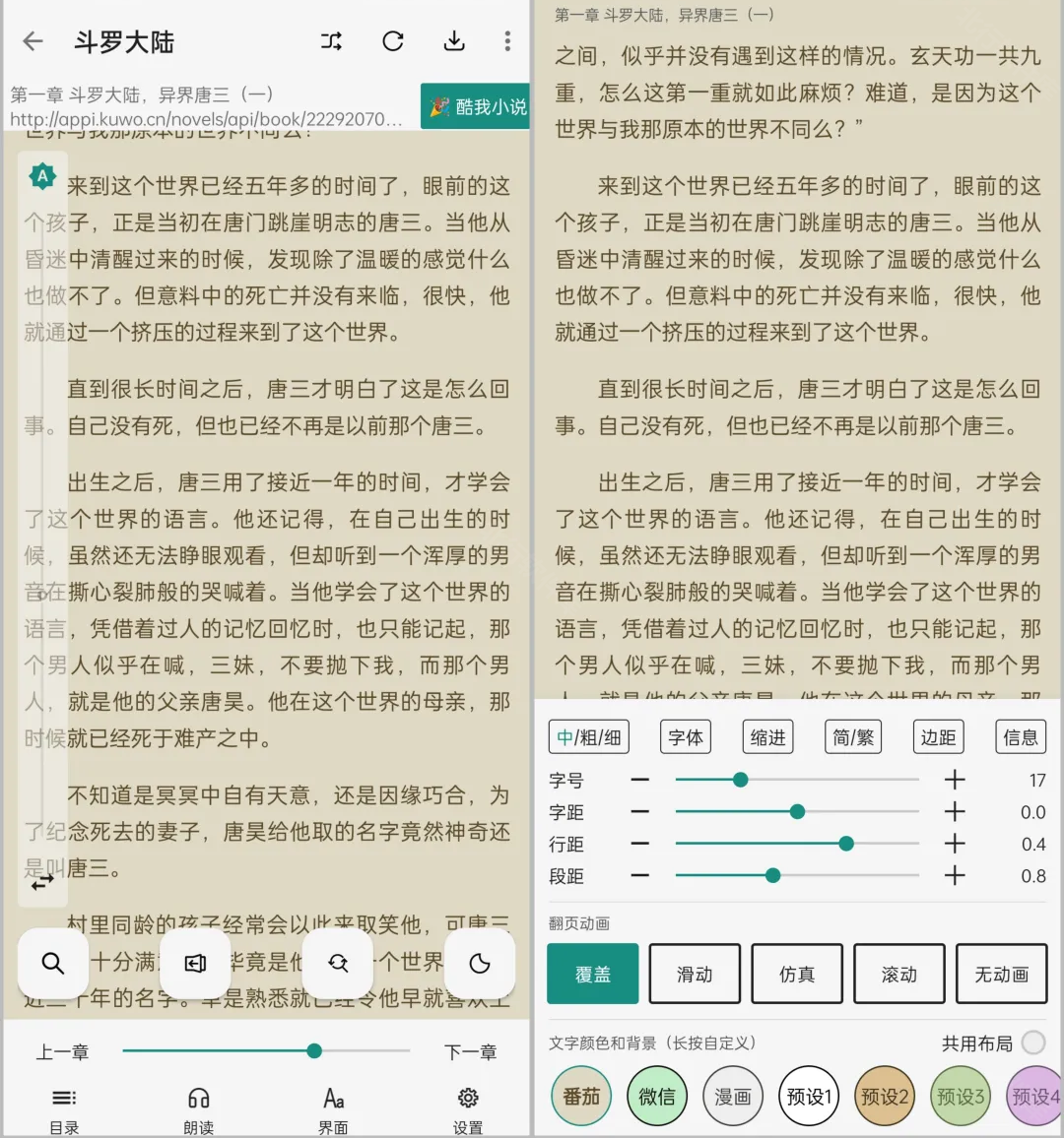 2、轻点屏幕可以打开布局设置,能够调整字号、字体、边距、背景、翻页动画等,适应个人的阅读习惯