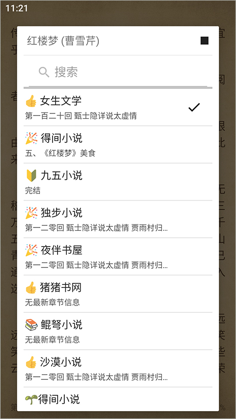 支持输入小说名称后自动匹配多个知名小说站点,实现一键全网搜书,快速定位目标书籍,解决“书荒”或章节缺失问题。
