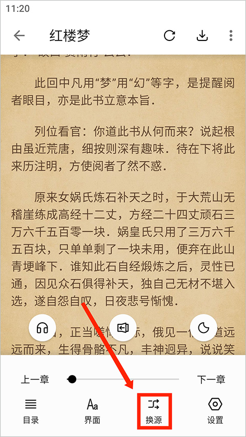 2、进入后,点击小说中部,唤出菜单,找到【换源】,点击打开。
