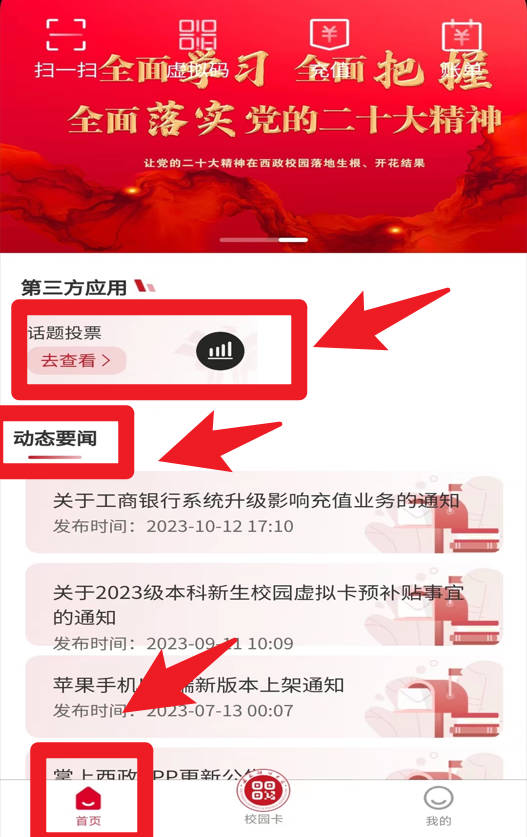 3、在此界面,用户能够查看动态要闻和学校最新通知,还能参与话题投票,及时掌握校园资讯与互动内容,丰富日常校园生活。