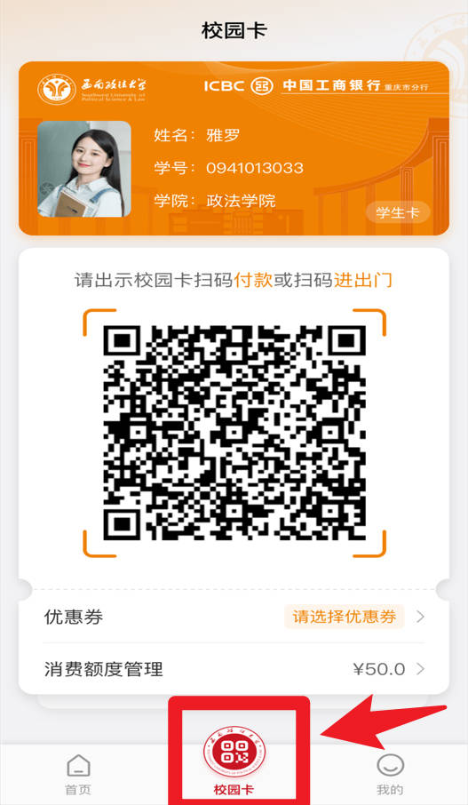4、在校园卡页面,用户可展示校园卡二维码用于消费和进出校门,同时还能管理消费额度及优惠券,实现校园支付与出行的一体化服务。