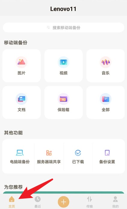 2、登录后默认进入首页,点击底部“首页”标签可以查看移动端备份分类,如图片、视频、音频等内容。