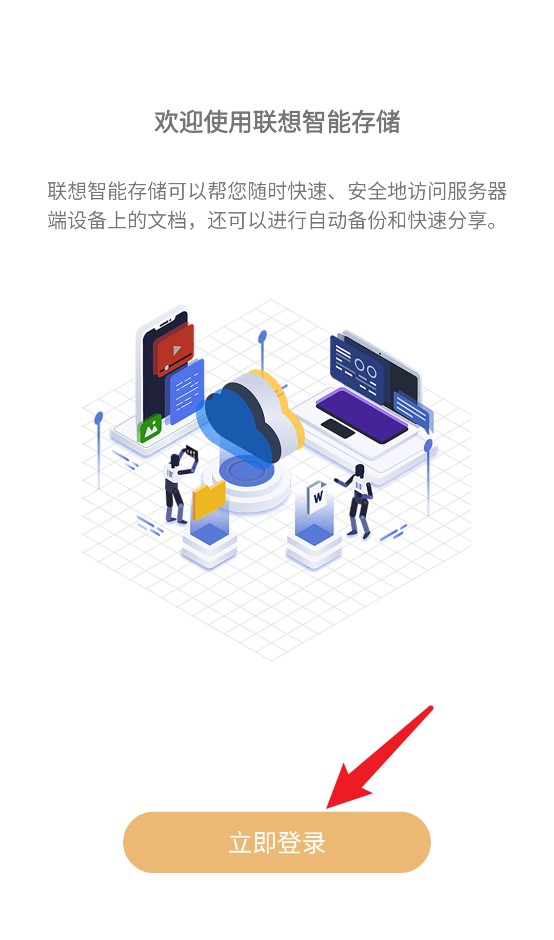 1、打开联想智能存储APP后点击“立即登录”按钮,即可进入系统准备使用各种备份与共享功能。