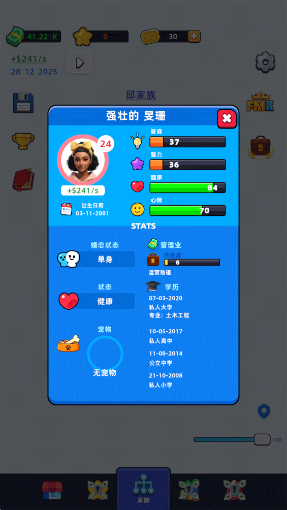 一款很棒的家庭生活模拟游戏!经营企业、养育孩子并模拟真实的家庭生活!这款游戏里面你可以选择自己起始的身份和玩法,开始工作、结婚、生子、发展自己的商业帝国,慢慢的成为城市重要人物!