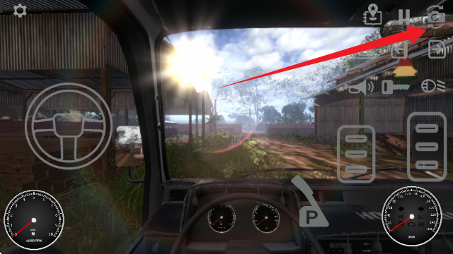 然后来到游戏操作界面如图所示,左边有方向盘和油量仪表盘。右侧有油门,制动器踏板,速度仪表版以及一些功能操作按钮。